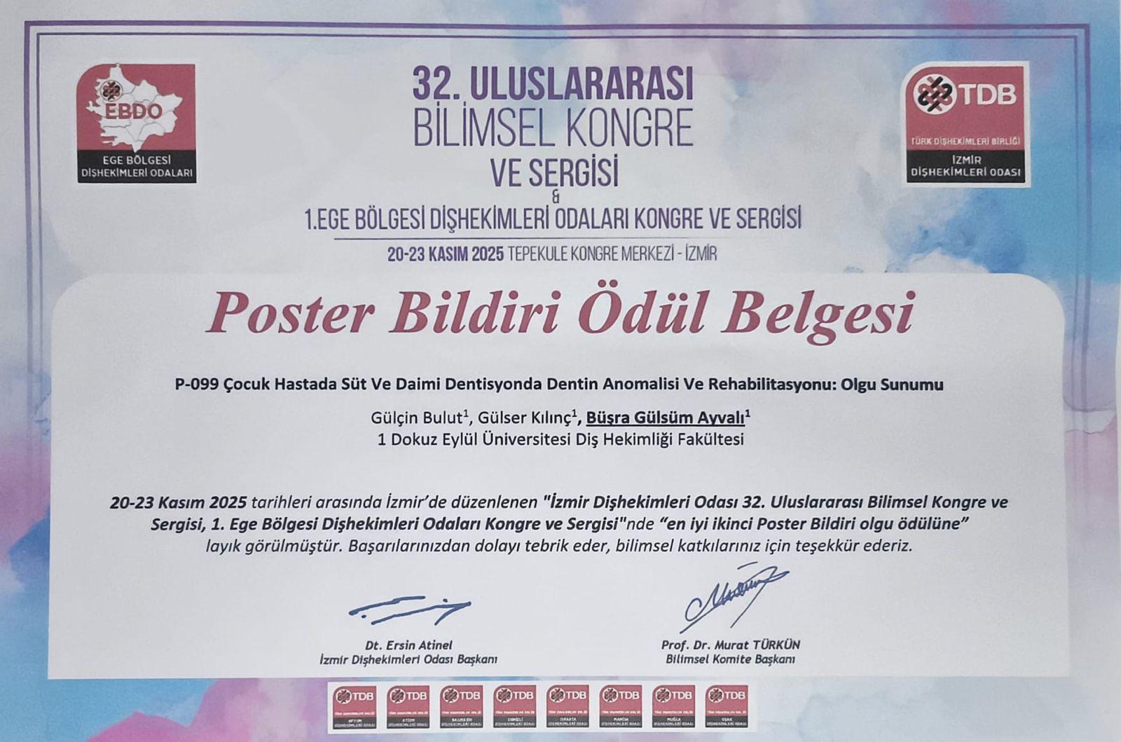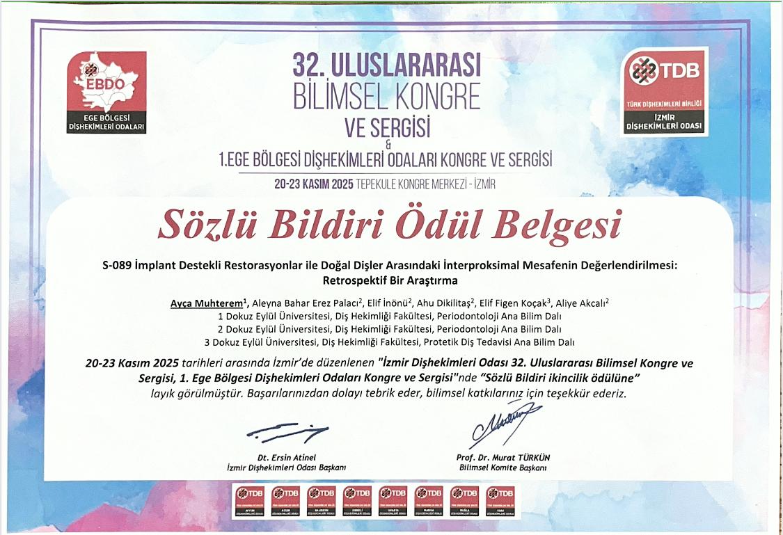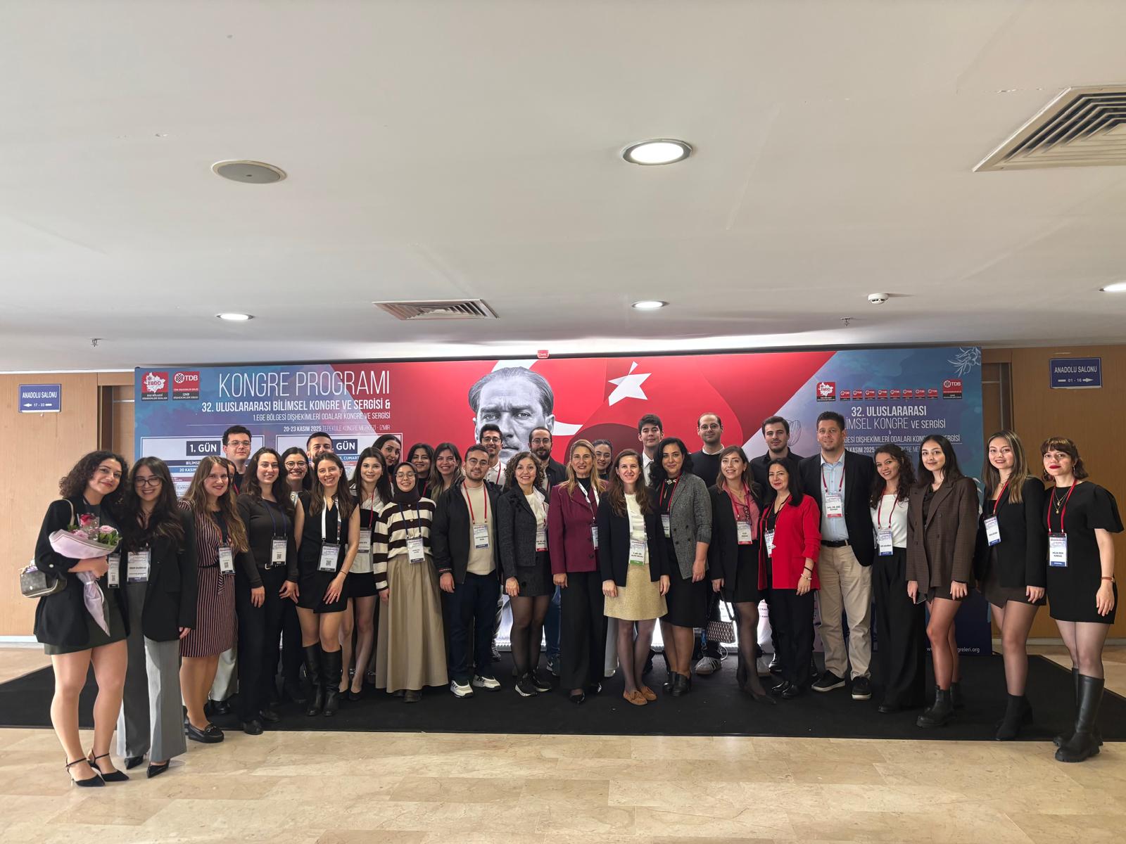 Dokuz Eylül Üniversitesi Diş Hekimliği Fakültesi öğretim üyeleri ve öğrencileri 20-23 Kasım 2025 tarihlerinde İzmir’de düzenlenen 32. İzmir Diş Hekimleri Odası Uluslararası Bilimsel Kongre ve Sergisi & 1. Ege Bölgesi Diş Hekimleri Odaları Bilimsel Kongre ve Sergisi’nde fakültemizi başarıyla temsil etmiştir. Kongreye Öğr. Gör. Dr. Saime Esin Güney, Arş. Gör. Ayça Muhterem, Arş. Gör Elifnur Demirbağ, Arş. Gör Büşra Saçak, Arş. Gör Bengisu Çağan Çetin, Arş. Gör İrem Kıray, Diş hekimliği fakültesi 5. sınıf öğrencimiz Erdinç Uğur Karataş sözlü sunumlarıyla, Arş. Gör Büşra Gülsüm Ayvalı sözlü ve poster bildiri sunumlarıyla katılım sağlamıştır. Ayrıca, öğretim üyelerimizden Prof. Dr. Aliye Akcalı, Prof. Dr. Gülser Kılınç, Doç. Dr. Ahu Dikilitaş, Doç. Dr. Anıl Özyurt, Doç. Dr. Nasibe Aycan Yılmaz, Dr. Öğr. Üyesi Elif İnönü, kongrede oturum başkanı olarak görev almış ve bilimsel programın yürütülmesine destek vermiştir.