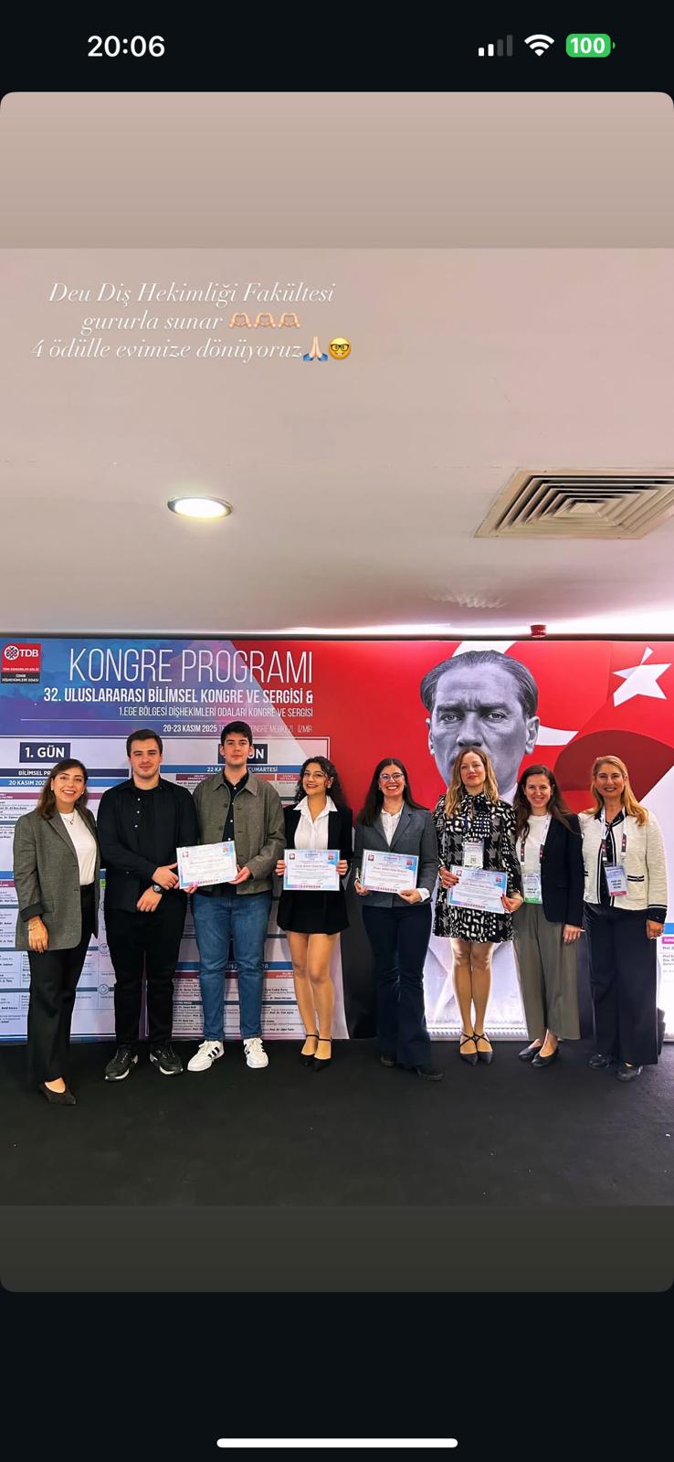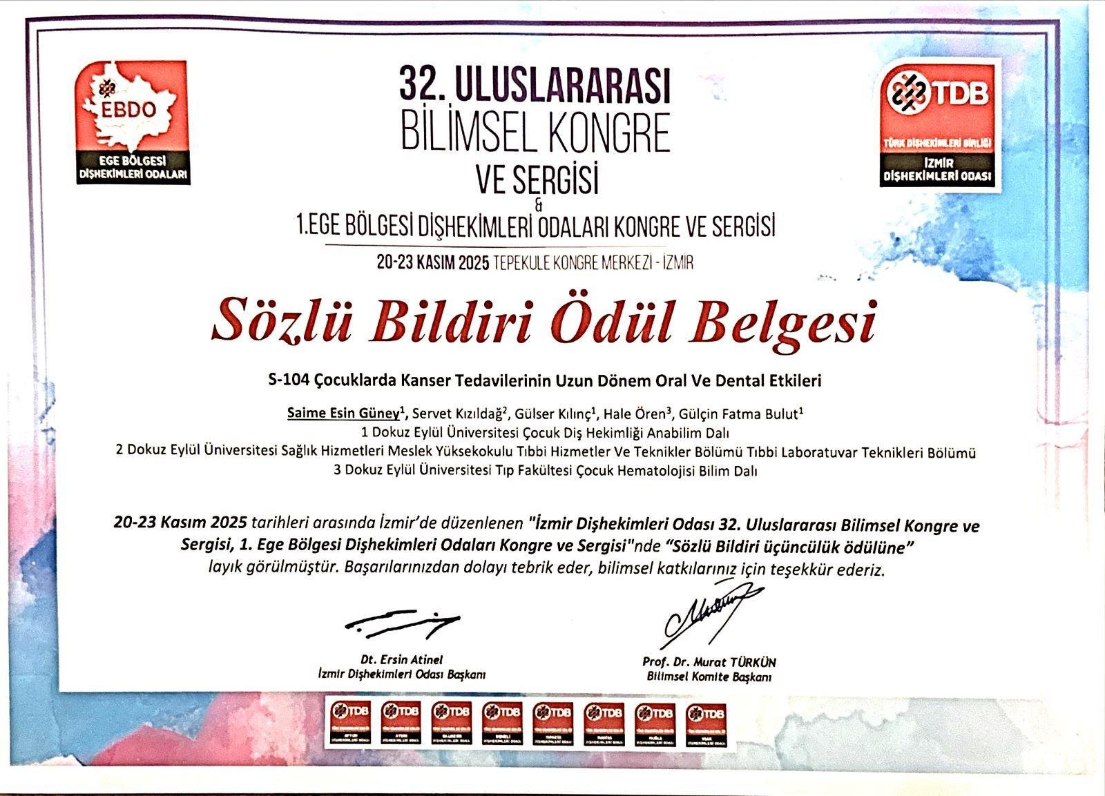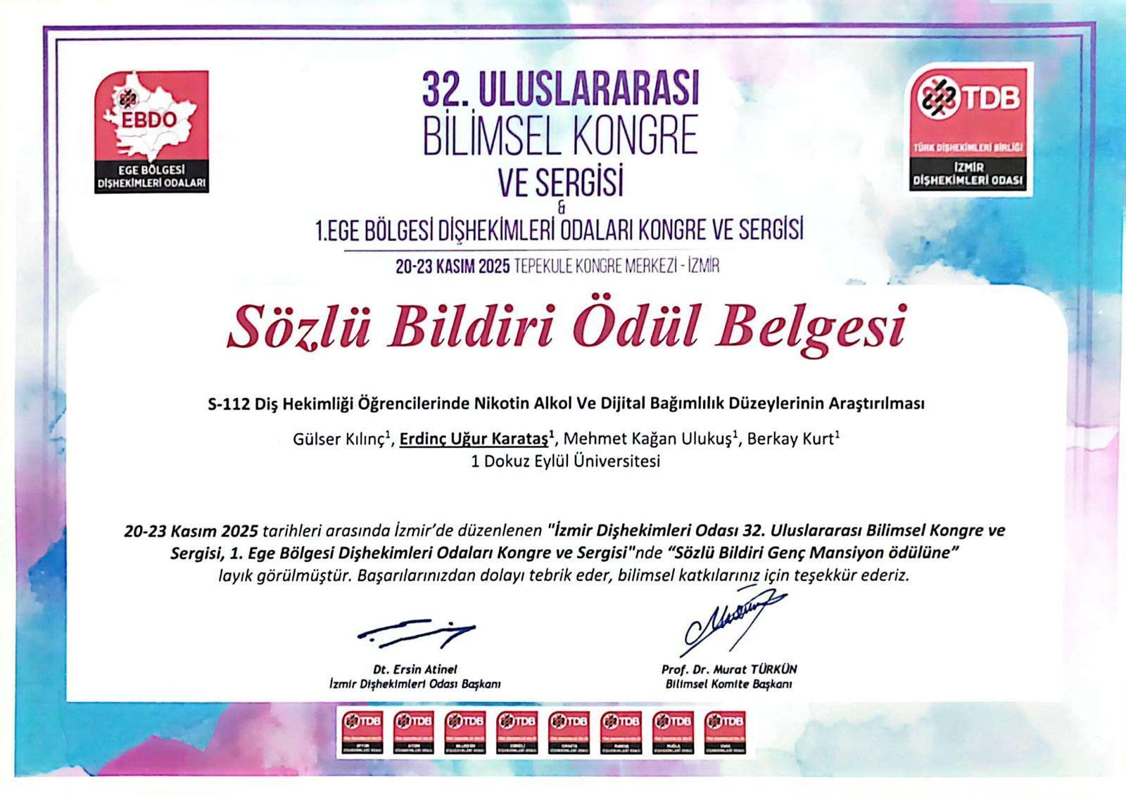 Dokuz Eylül Üniversitesi Diş Hekimliği Fakültesi öğretim üyeleri ve öğrencileri 20-23 Kasım 2025 tarihlerinde İzmir’de düzenlenen 32. İzmir Diş Hekimleri Odası Uluslararası Bilimsel Kongre ve Sergisi & 1. Ege Bölgesi Diş Hekimleri Odaları Bilimsel Kongre ve Sergisi’nde fakültemizi başarıyla temsil etmiştir. Kongreye Öğr. Gör. Dr. Saime Esin Güney, Arş. Gör. Ayça Muhterem, Arş. Gör Elifnur Demirbağ, Arş. Gör Büşra Saçak, Arş. Gör Bengisu Çağan Çetin, Arş. Gör İrem Kıray, Diş hekimliği fakültesi 5. sınıf öğrencimiz Erdinç Uğur Karataş sözlü sunumlarıyla, Arş. Gör Büşra Gülsüm Ayvalı sözlü ve poster bildiri sunumlarıyla katılım sağlamıştır. Ayrıca, öğretim üyelerimizden Prof. Dr. Aliye Akcalı, Prof. Dr. Gülser Kılınç, Doç. Dr. Ahu Dikilitaş, Doç. Dr. Anıl Özyurt, Doç. Dr. Nasibe Aycan Yılmaz, Dr. Öğr. Üyesi Elif İnönü, kongrede oturum başkanı olarak görev almış ve bilimsel programın yürütülmesine destek vermiştir.